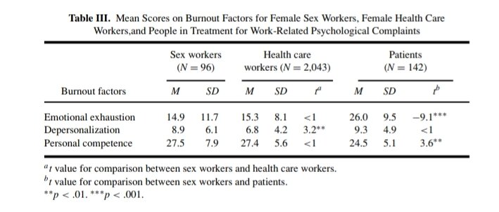 Por ejemplo, en este estudio donde se analiza la prevalencia del "burnout" o síndrome de desgaste profesional en las trabajadoras sexuales comparándolas con una muestra de enfermeras encontramos que los resultados no difieren demasiado.