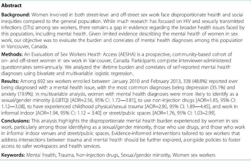 En este otro estudio, que analiza la salud mental de las prostitutas callejeras, nos encontramos con que es cierto que muchas han sido diagnosticadas con trastornos mentales (el 48%, concretamente), si bien en muchas ocasiones los traumas provienen de situaciones ajenas al TS.