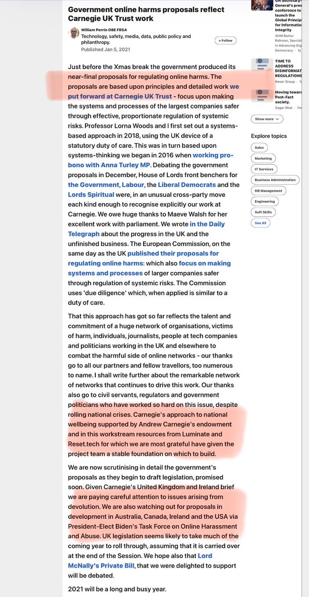 “The proposal has been developed by Professor Lorna Woods OBE (Professor of Internet Law, University of Essex), William Perrin OBE (Carnegie UK Trustee) and Maeve Walsh (Carnegie UK Associate). William Perrin and Professor Woods received OBEs in recognition for their work in the Queen’s Birthday Honours List in 2020.”