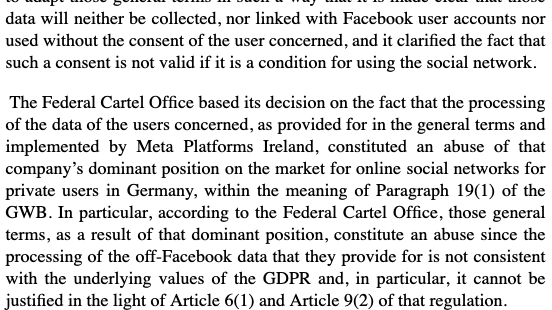 The full decision is quite a long read but here is how they deftly described decision of the cartel office. In lay terms, a user can't give proper consent ("freely given") due to the *dominance* of Meta's apps (Facebook, Instagram, WhatsApp). This goes back to 2018 - oomph. 4/9