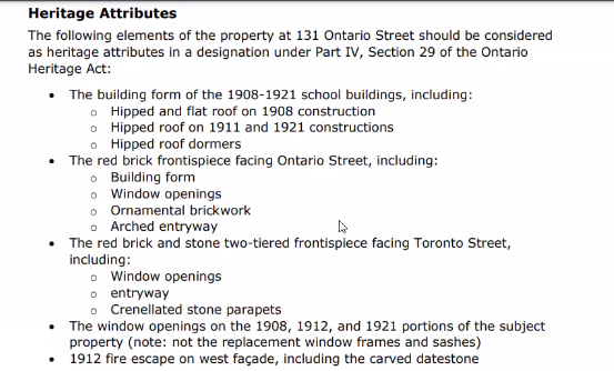 Designation attributes cover the 1906, 1912 and 1921 exterior attributes. Mallon say this was done so as to allow UGDSB to make accessibility changes inside. Also, 1960s additions aren't heritage-y enough.