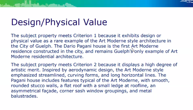 Member Corman asks if the owner's been involved at all. Nagy says she has also send them a letter but has not heard back. Senior Heritage Planner Robinson has apparently had conversations with the owner previously.