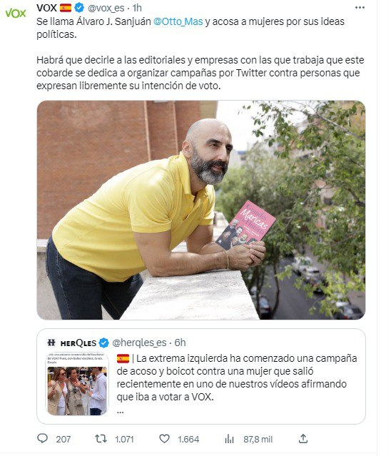 Por otra parte hay que ver el matonismo y la falta de escrúpulos de estos actores, desde VOX y el medio que entrevistó y publicó estas declaraciones hicieron campaña con la persona que difundió el vídeo informando que era directiva de Orange, obligándole a cerrar sus redes.