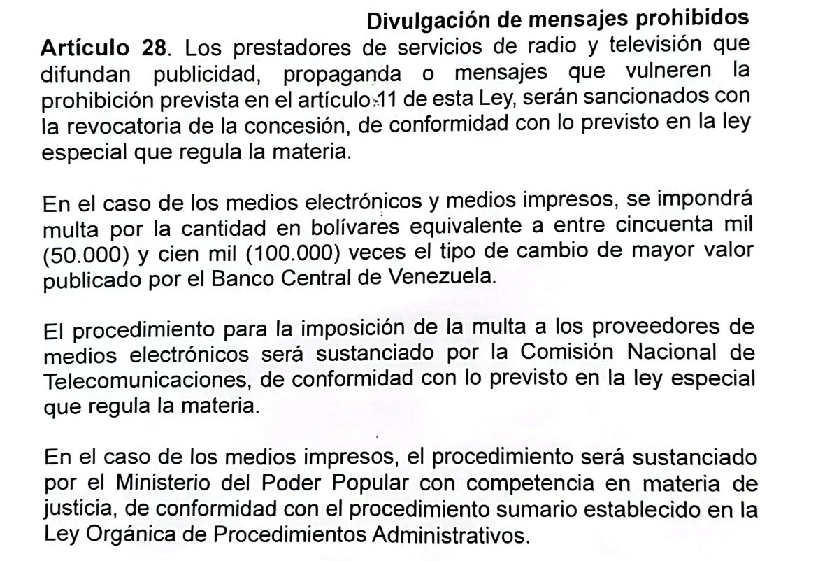 2. ¿Qué supone esto para los medios de comunicación (y redes sociales)? Por un lado, que tendrán prohibido difundir mensajes contrarios al chavismo y, por otro, que estarán obligados a difundir mensajes pro-chavistas. ¿Y si no acatan? Revocación de licencias y multas.