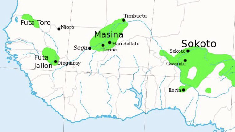 27. There would be the domino effect; the rise of the Islamic empires of Massina (in present day Mopti & Ségou Regions of Mali), Tukulor (in present day Senegal to Timbuktu Mali), & in Northern Guinea as well.