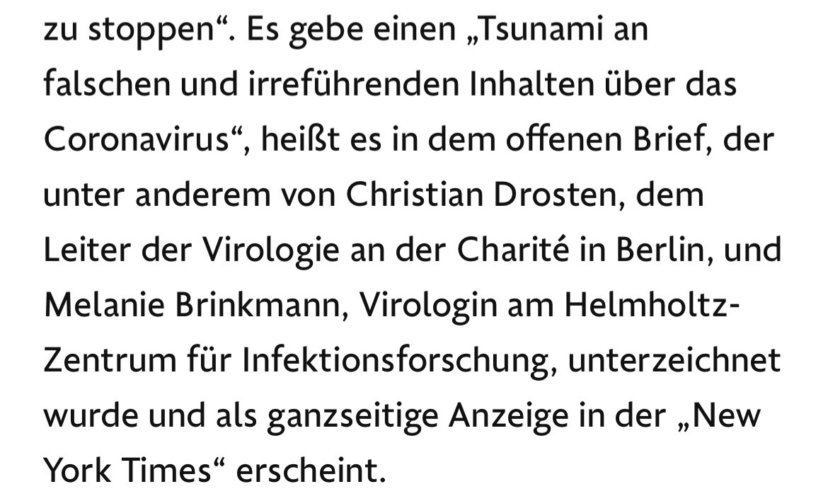 4/ … dem Leiter der Virologie an der #Charité in Berlin, und Melanie #Brinkmann, Virologin am Helmholtz-Zentrum für Infektionsforschung, unterzeichnet wurde und als ganzseitige Anzeige in der ‚New York Times‘ erscheint. … Die bisherigen Maßnahmen der Konzerne, gemeldete …