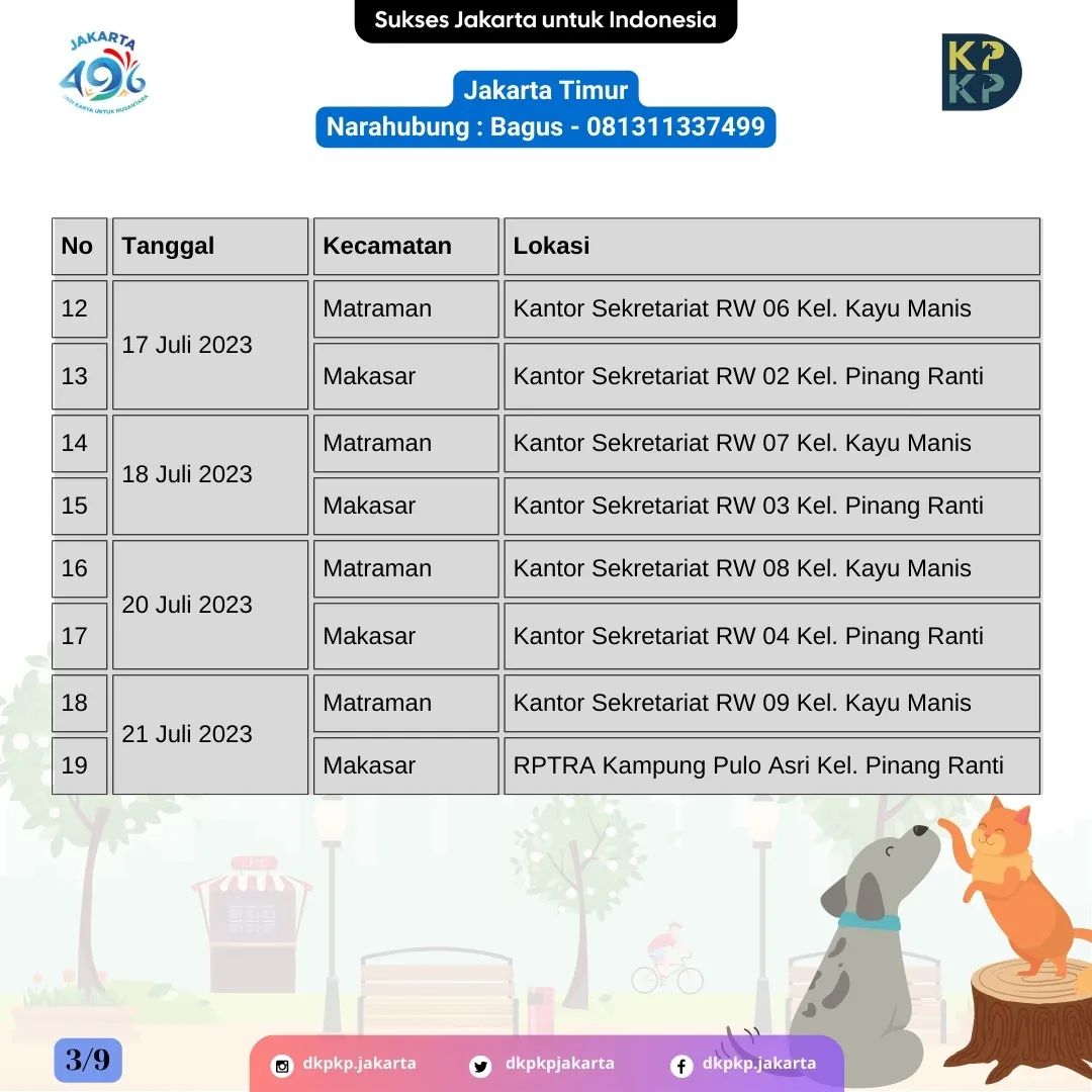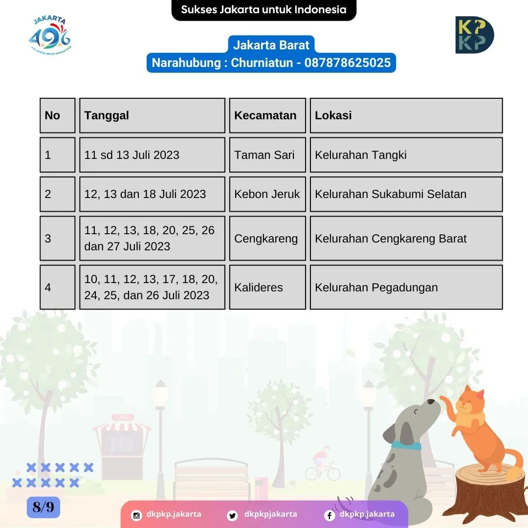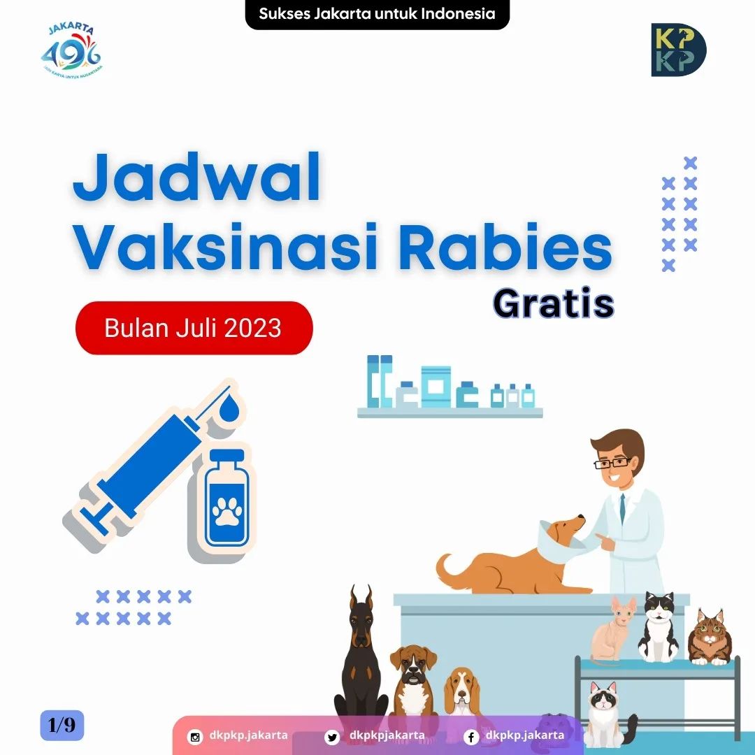 Berikut adalah jadwal vaksinasi rabies gratis yang dilaksanakan di 5 wilayah Kota Administrasi dan Kabupaten Kepulauan Seribu untuk bulan Juli 2023.
