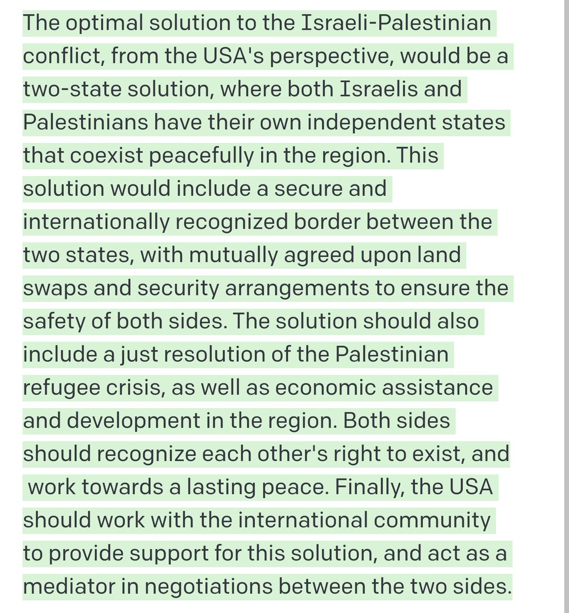 Describe the optimal solution, from the USA's perspective, to the Israeli Palestinian conflict: