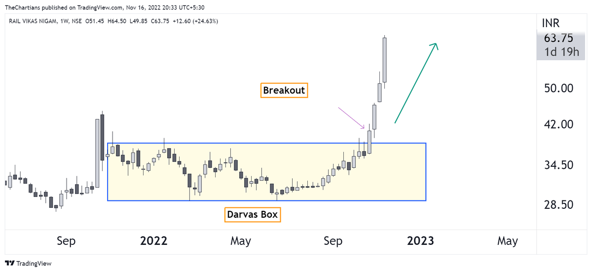 Price was trading in a box (range 29-39) for one year. After the breakout, RVNL rallied from 39 to 64 in one month. Returns of 64%.