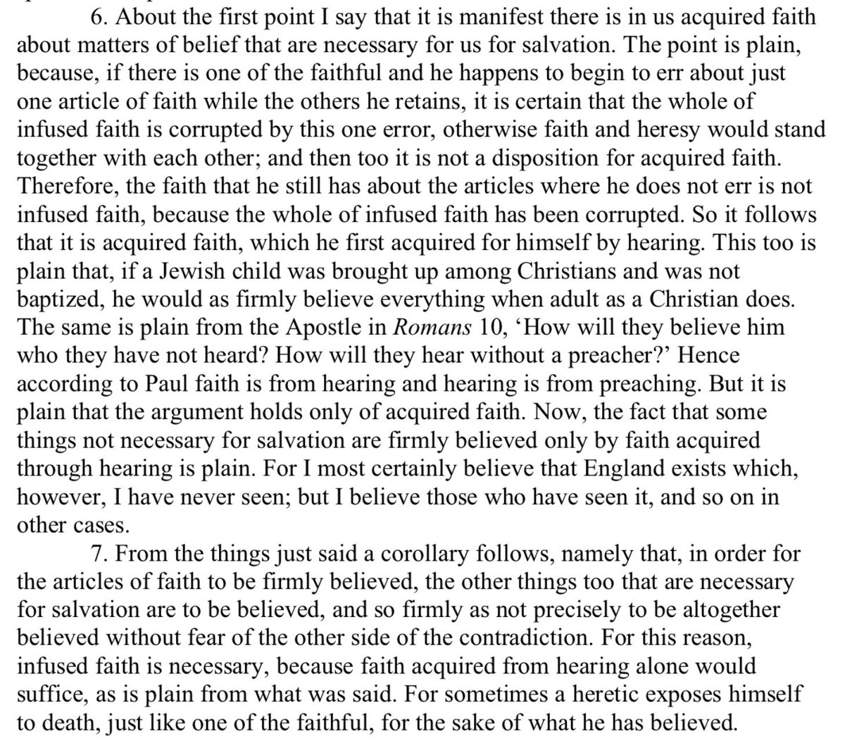 In Ord III d. 23 q. un. n. 6-7, Scotus gives the example of a Jewish child who even believes in the Trinity and incarnation on account of being taught it, but believes it only on acquired faith and not on infused faith, and so is not saved.