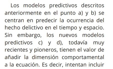 Mientras que los modelos predictivos de autores y delitos se centrarían en predecir la ocurrencia del hecho delictivo en el tiempo y el espacio, los de víctimas e identidad de autores añadirían como variable el comportamiento a la ecuación.