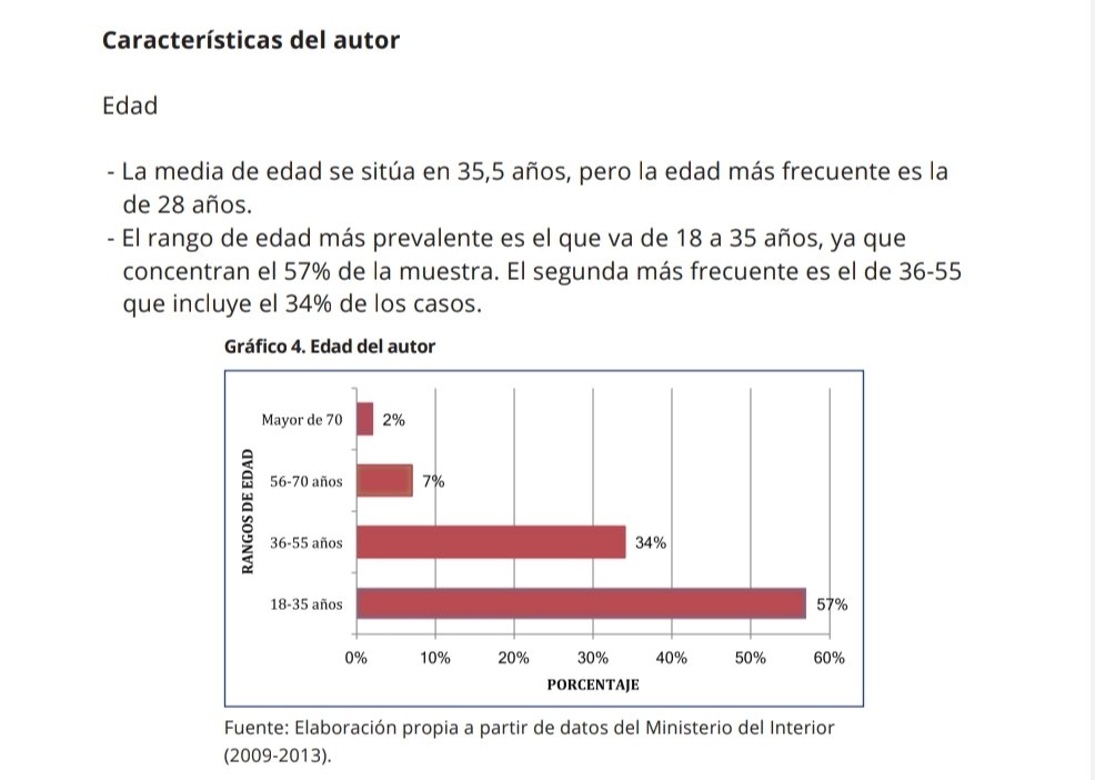 Respecto a las características de los autores, el informe nos señala que la media de edad se sitúa en 35,5 años, siendo los 28 años la edad más frecuente y siendo el rango de edad situado entre los 18 y los 35 años el que más prevalencia de agresiones sexuales contiene.