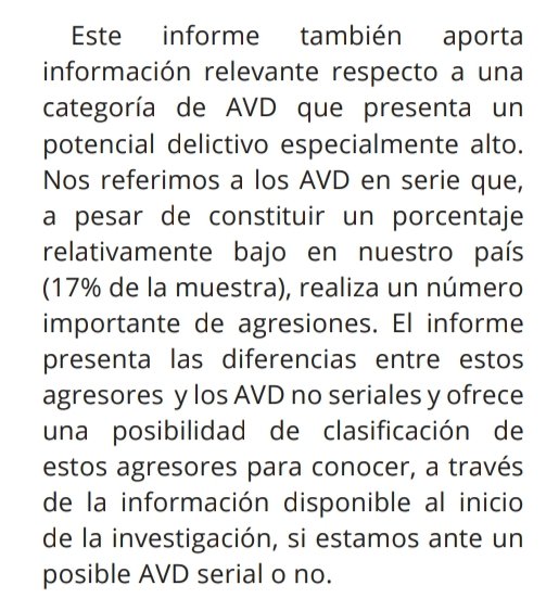 Asimismo, se señala que el informe también contendría información importante respecto a los violadores en serie, que pese a constituir un porcentaje bajo de los AVD realizan un número importante de agresiones.