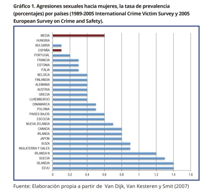 El gráfico 1 nos aporta datos que incluyen un seguimiento longitudinal entre los años 1989 y 2005, que concluirían que España posee de los índices de agresiones sexuales hacia mujeres más bajos de Europa, considerablemente por debajo de la media.
