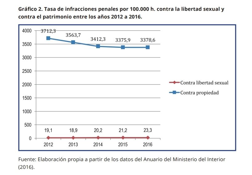 El gráfico 2 compara las tasas de infracciones por cada 100.000 habitantes en España en materia de delitos contra la libertad sexual y contra el patrimonio, mostrando el descenso de los segundos y un leve aumento en los primeros, pero situándose muy por debajo.