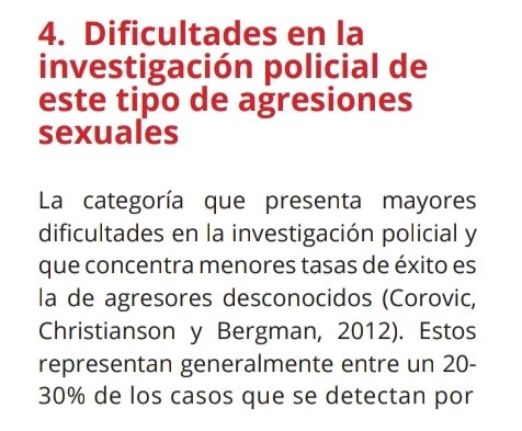 Es decir, que estos datos difícilmente podrían ser aplicables, sin ningún tipo de contexto, al recuento actual de agresiones sexuales. Aparte, este estudio únicamente contabiliza las agresiones sexuales con víctima desconocida, es decir, sin relación con el agresor.