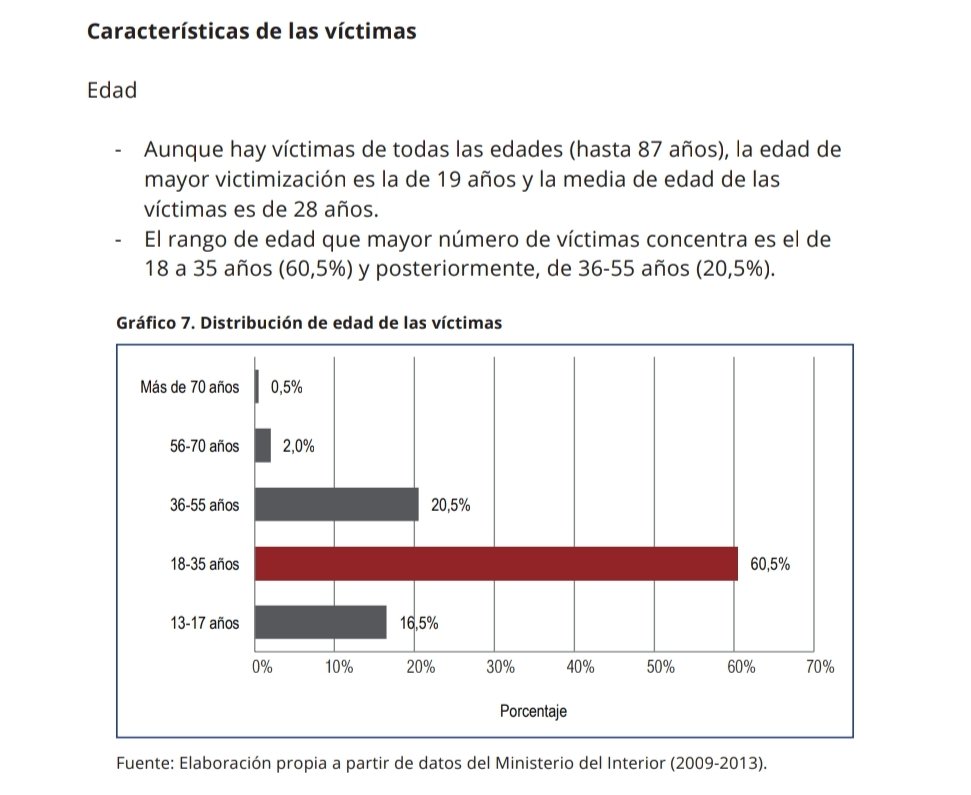 Respecto a las características de las víctimas, encontramos víctimas de todas las edades, pero concentrándose un 60% de ellas en el rango de edad de entre 18 y 35 años, seguido por un 20% en el rango de edad de entre los 36 y los 55 años (tendencia similar a la de los agresores).