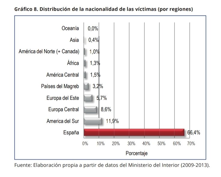 El gráfico 8 se encarga de desgranar la nacionalidad de las víctimas, siendo la mayoría de víctimas españolas (66,4%), seguido muy de lejos por personas de América del Sur (11,9%). Los países del Magreb ocupan un papel muy inferior entre las víctimas, siendo solamente un 3,2%.