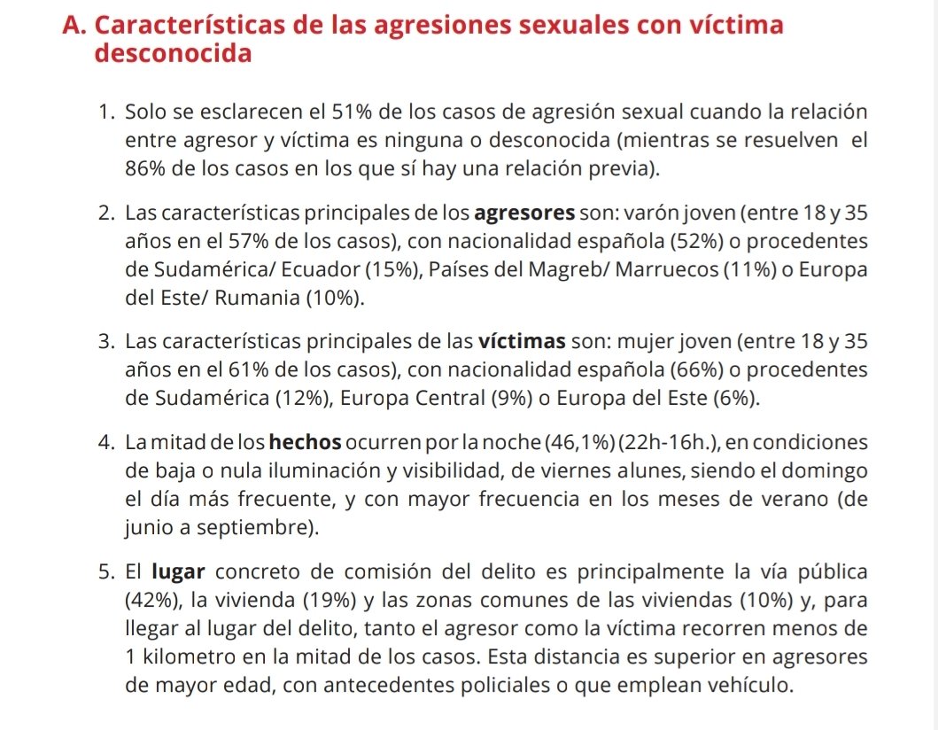 El estudio concluye lo siguiente sobre las agresiones sexuales con víctima desconocida. Esto vendría a constituir un resumen de los resultados del informe, tanto a nivel de características de agresiones como de perfiles de agresores.
