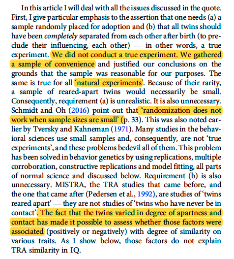 1/ I have noticed that some on Twitter, even prominent scientists, have called the historic Minnesota Study of Twins Reared Apart (MISTRA) "fake". The study's author, Thomas Bouchard, has recently published an exhaustive rebuttal to critics.