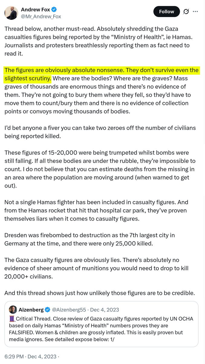 3/10 In a 24 April, 2024 tweet, Fox claimed that "Hamas's" [i.e., the MoH's] fatalities estimates was a "ridiculously inflated count."