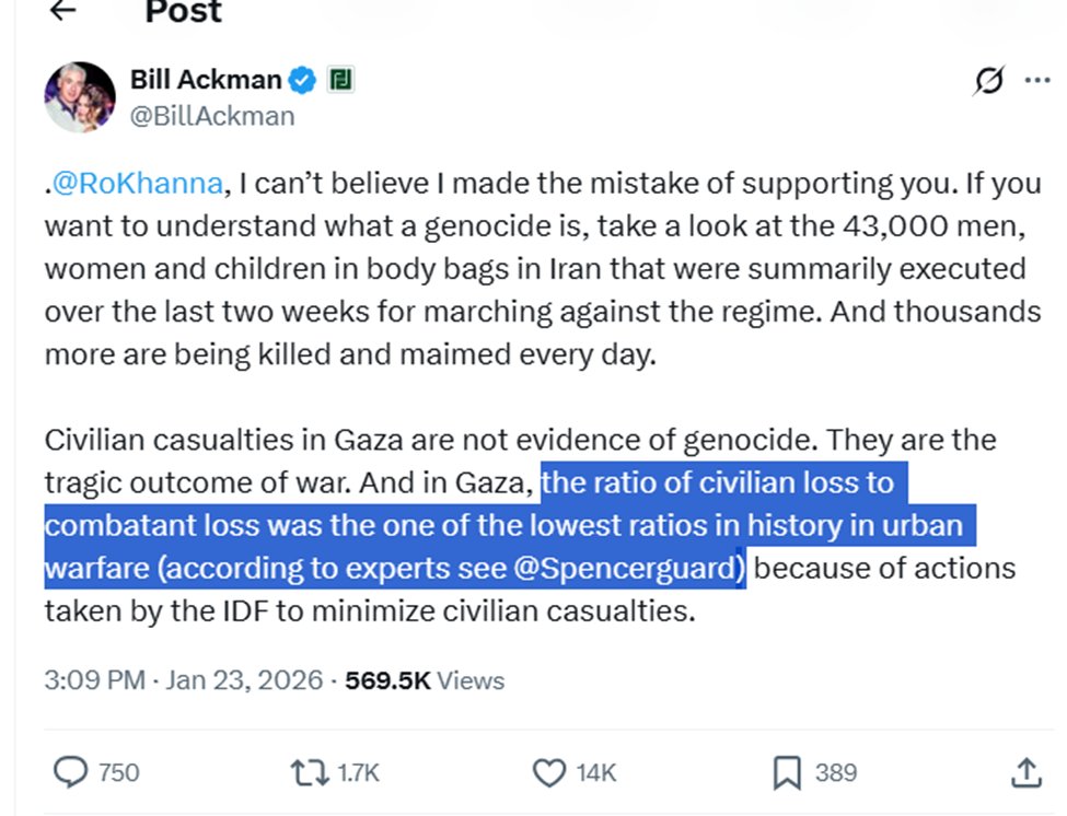 1/15 This Historic Lie, that the ratio of civilians to combatants killed in Gaza is "one of the lowest ratios in history in urban warfare," is pushed by frauds like @BillAckman, @spencerguard, & @netanyahu.