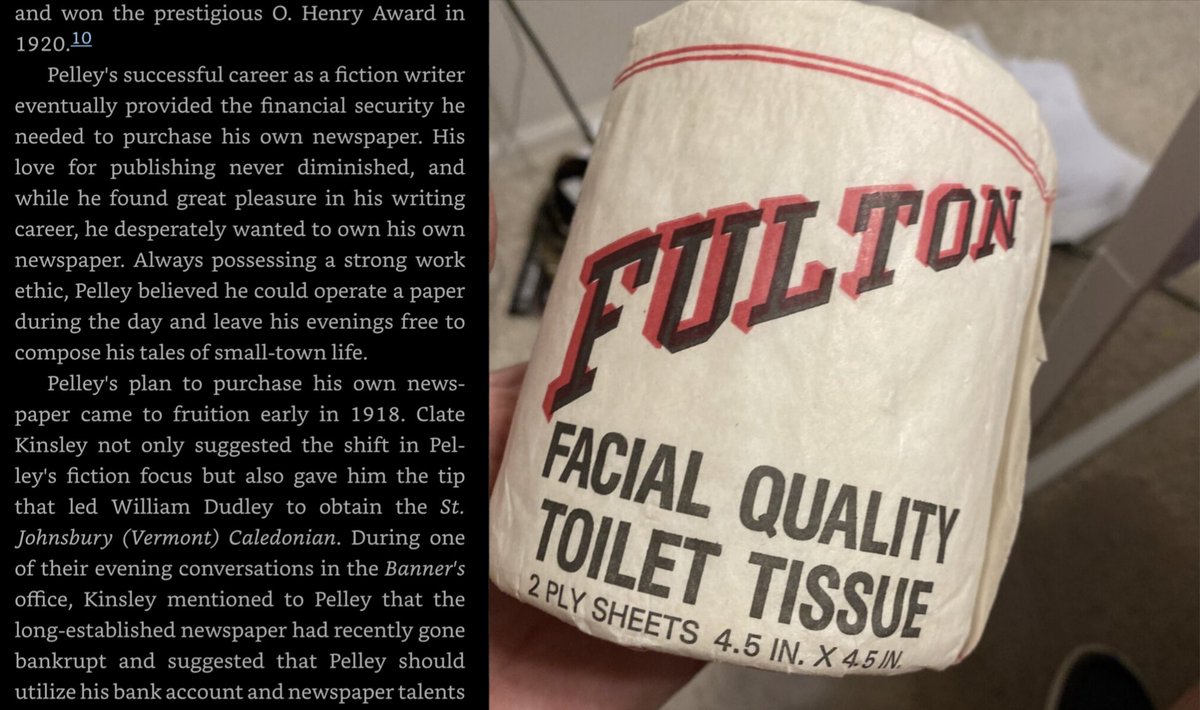 3/ Using the 💴 he'd made as superintendent & treasurer of the Fulton Toilet Paper Co—where he worked w/ his Dad as a young man—& as a short story writer, Pelley bought the "St. Johnsbury Caledonian", a tiny daily in a lil town in VT. After making the paper profitable, Pelley...
