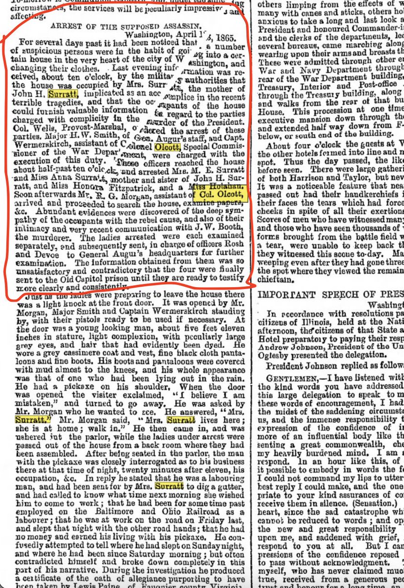 26/ Managed to find a contemporary article in the "Leeds Mercury" that named Col. Olcott & detailed Mary Surratt's arrest approx. 2 weeks following the assassination. I'm unsure if Olcott was physically present at the raid, but his assistant Capt. Wermerskirch certainly was.