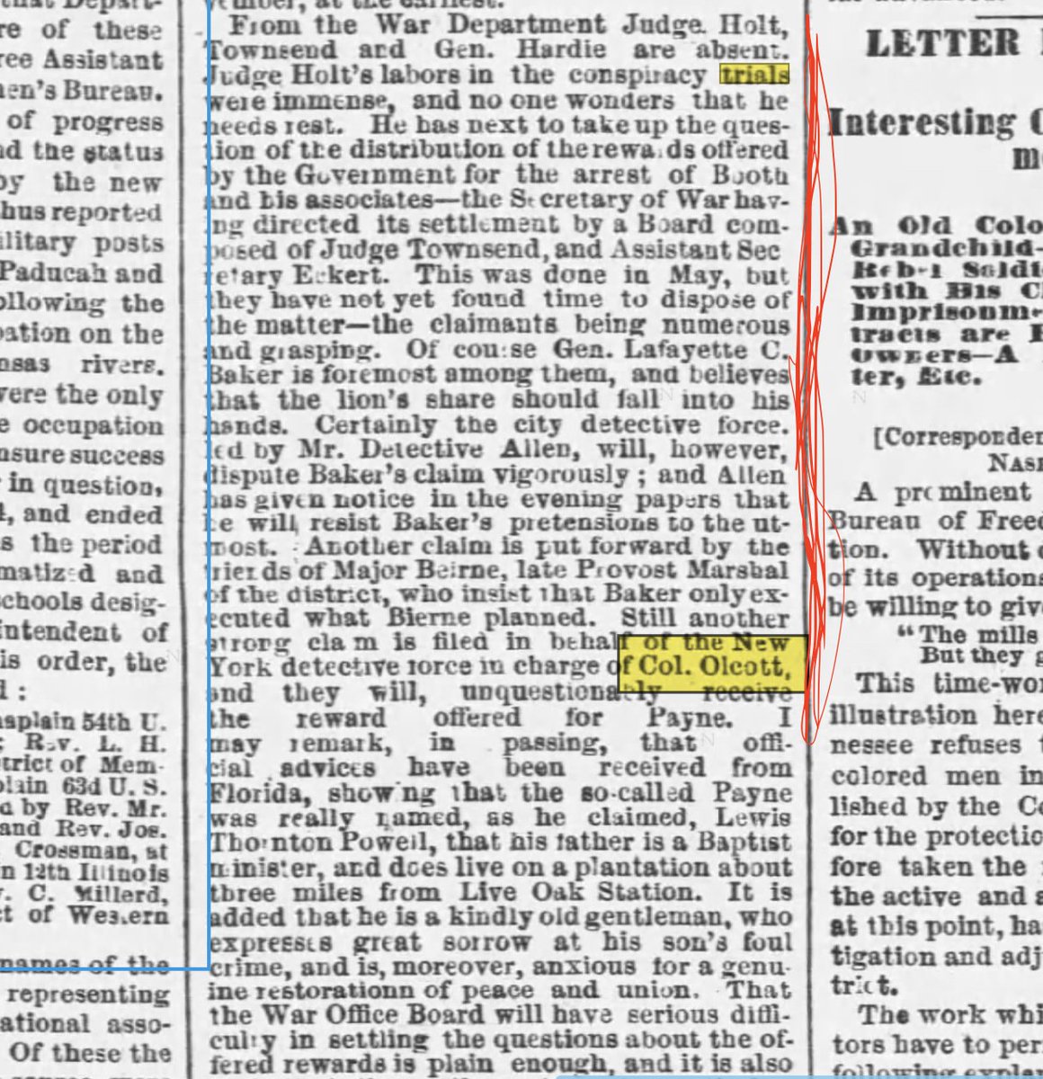27/ Can't help myself. This is wild. Here's an excerpt from an article by the Washington correspondent for the Chicago Tribune (Aug. 9, 1865) revealing the various parties that vied for the $100,000 Booth, etc. reward. Olcott & his detectives were 1 set of claimants—Baker another