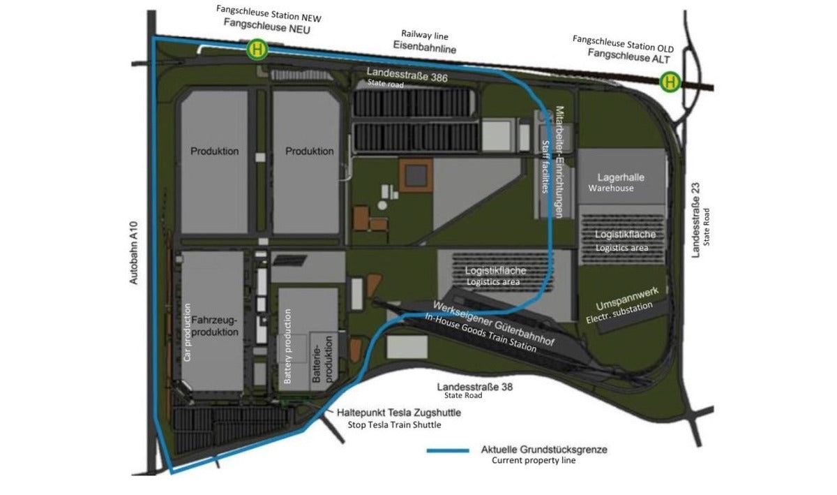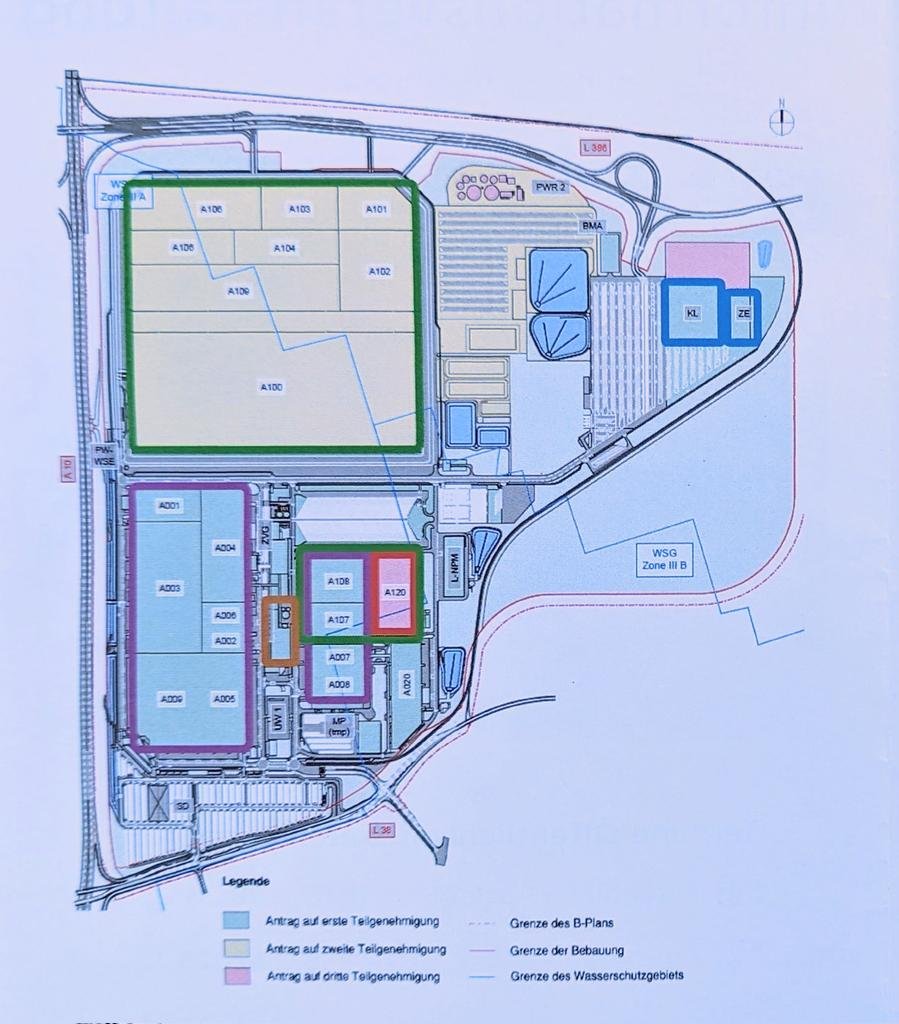 Heute produziert Tesla nur in der Halle unten links, die anderen wurden noch nicht gebaut. Trotzdem wird hier heute jedes siebte Auto in Deutschland produziert. Tesla hat jetzt den Antrag für die zweite Halle gestellt, beide Hallen sollen dann zusammen 1 Million Autos produzieren Image