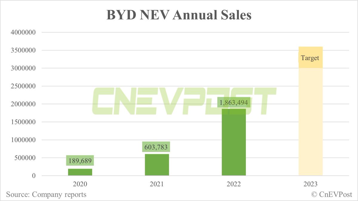 Jedenfalls will BYD auch dieses Jahr weiter exponentiell auf 3 Millionen Plug-In Hybride und Elektroautos wachsen, strebt 3,6 Millionen an. Image