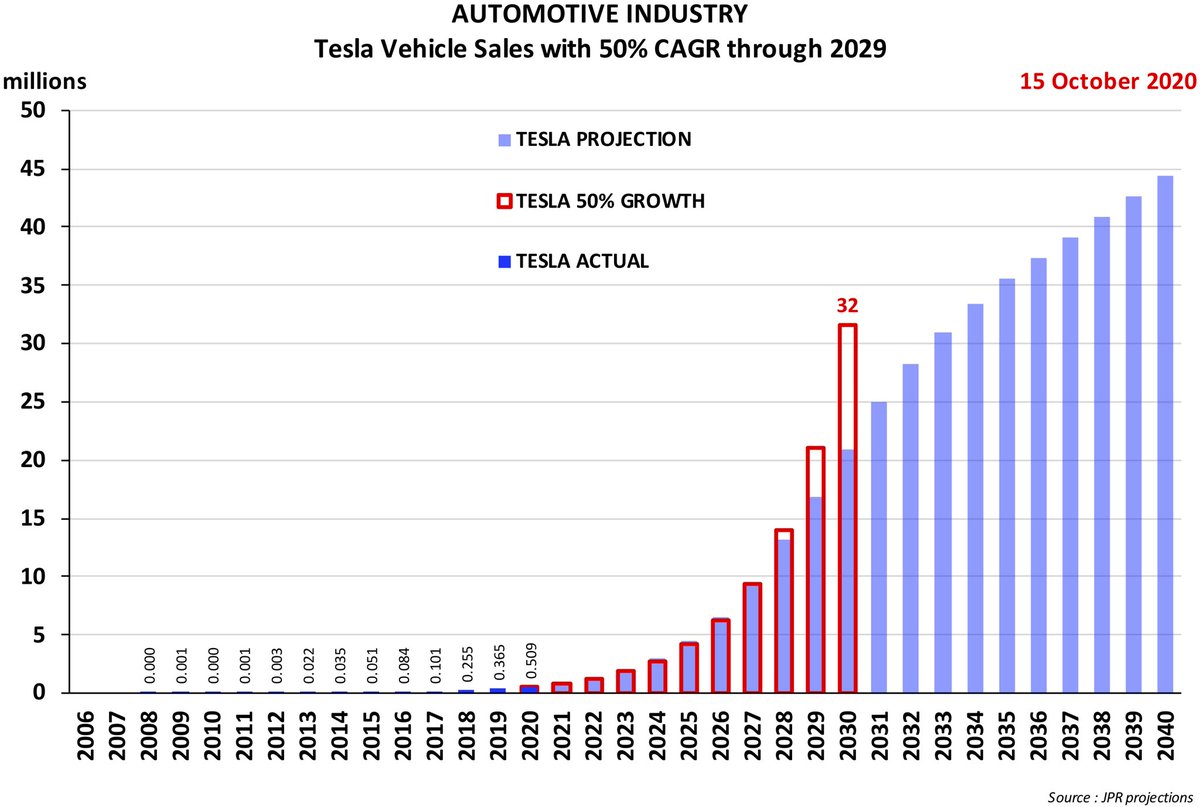Falls es Tesla gelingt das Ziel bis ins Ende des Jahrzehnts aufrecht zu erhalten, würden sie ihr Ziel für 2030 von 20 Millionen Autos pro Jahr sogar übertreffen. Das ist unwahrscheinlich, aber 20 Millionen ist schon sehr viel, doppelt so viel Toyota. Image