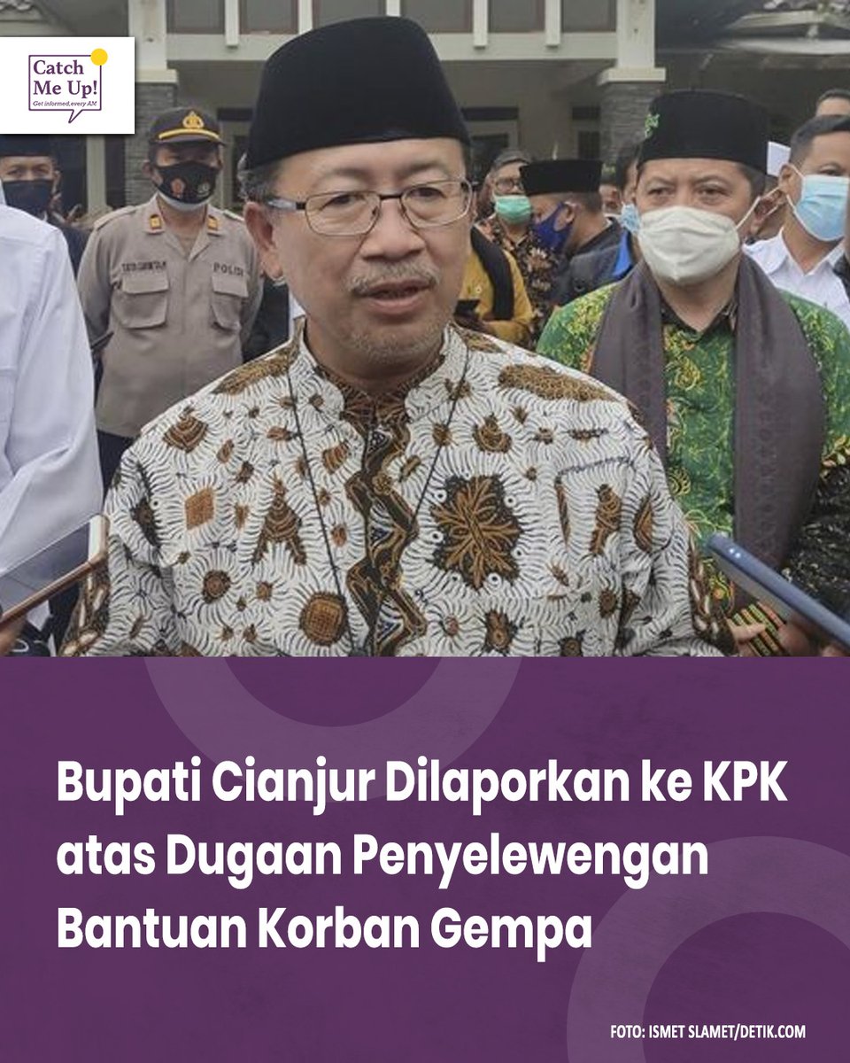 Bupati Cianjur Herman Suherman dilaporkan oleh Acsena Humanis Foundation atas dugaan penyelewengan bantuan korban gempa Cianjur, Jawa Barat, pada Jumat (23/12).