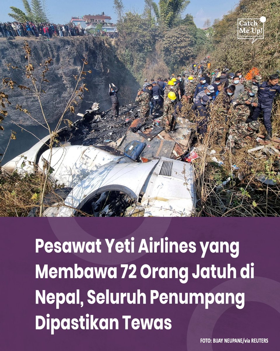 Pesawat Yeti Airlines yang membawa 68 penumpang dan empat anggota awak jatuh dan terbakar di Pokhara, Nepal pada Minggu (15/1). Dilaporkan seluruh penumpang dipastikan tewas dan telah dievakuasi.