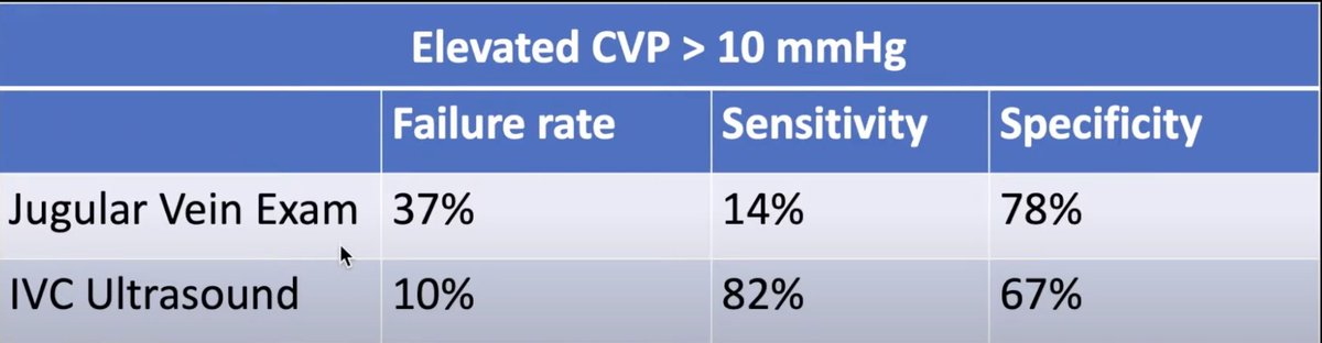 If you look up the data, JV exam is inferior to IVC ultrasound in assessing CVP (part of the volume status exam). IVC US has a higher sensitivity (82%) and lower failure rate (10%).