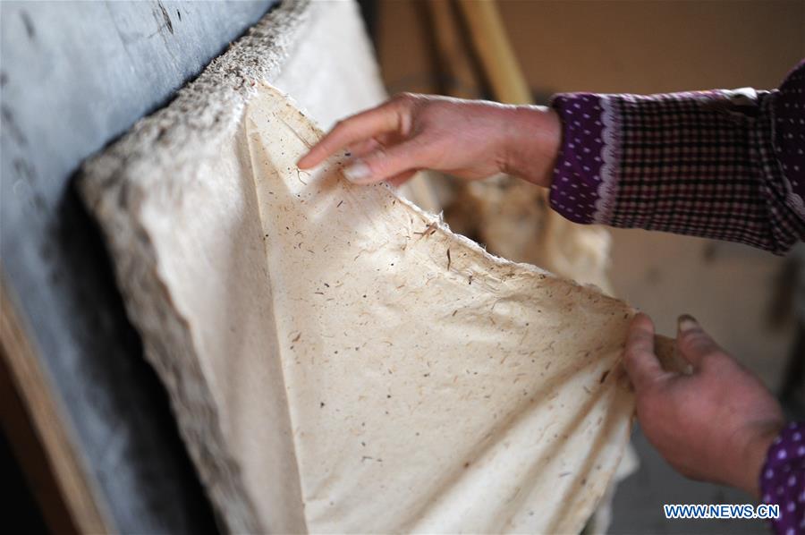 Dia siat dan rebus kulit kayu pokok mullberry, henyak dengan sisa serat pokok ganja dan sisa jaring ikan. Campuran benda benda ni kemudian diskirinkan atas penapis dan dikeringkan menjadi kertas.