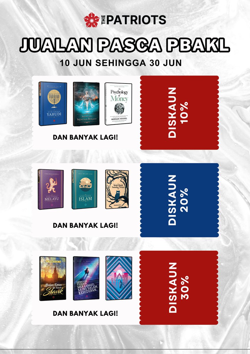 Kami nak bagitahu yang hari ini merupakan hari terakhir JUALAN PASCA PBAKL. Kami takut yang anda akan terlepas buku-buku kami, dengan harga diskaun! Cepat dapatkan di Shopee kami di: https://t.co/sfDPFefNPfbit.ly/bukupatriots