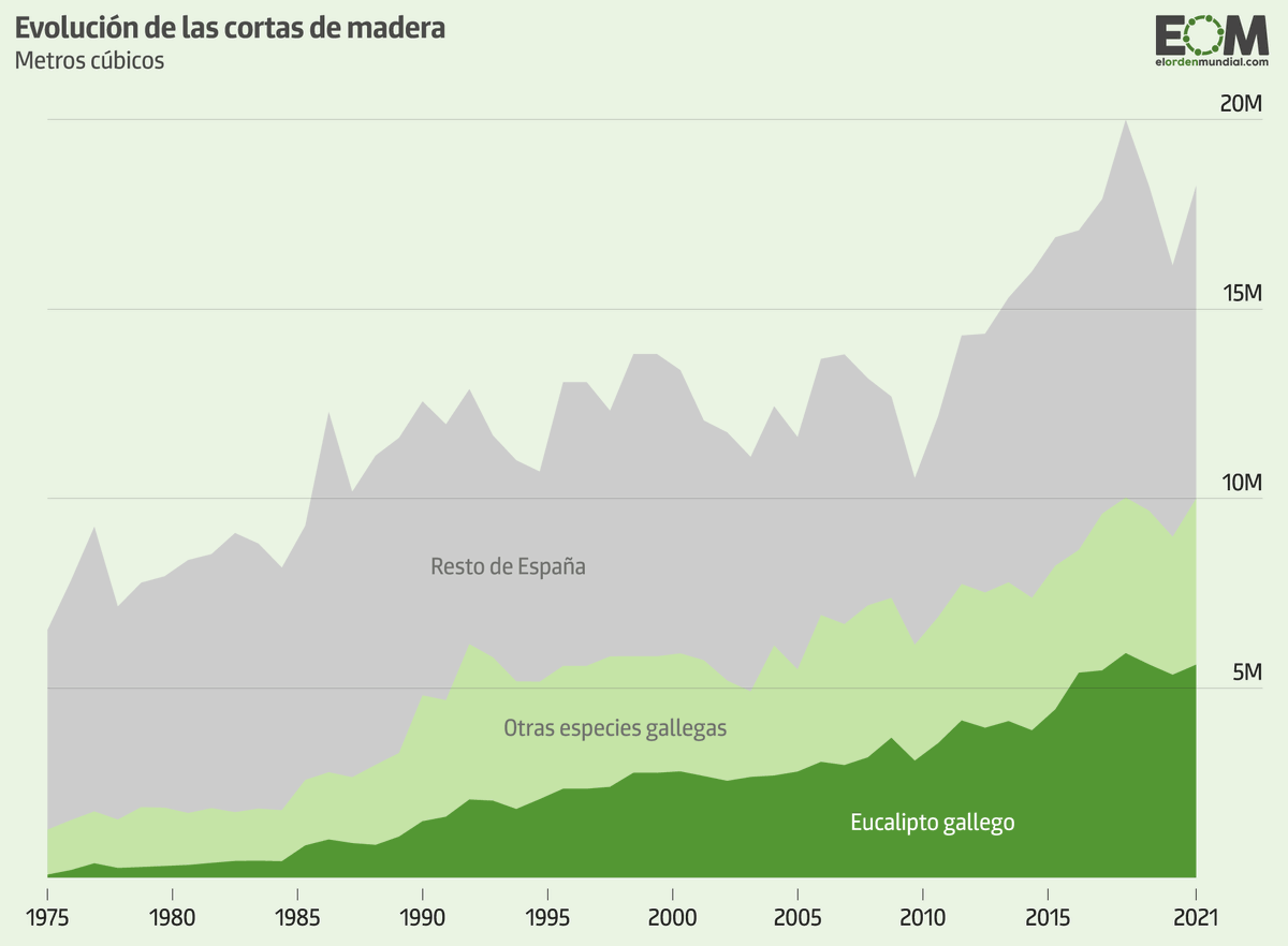 Galicia produce el 55% de la madera de España gracias al eucalipto, una especie inflamable y pirófita que puede esparcir el fuego en grandes incendios.