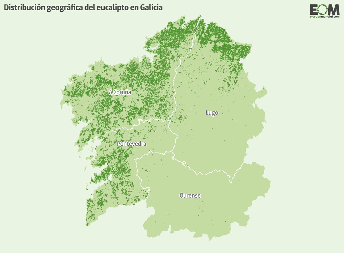 Las plantaciones de eucalipto se concentran en la costa y desaparecen conforme se adentran en el interior de Galicia (🟢).