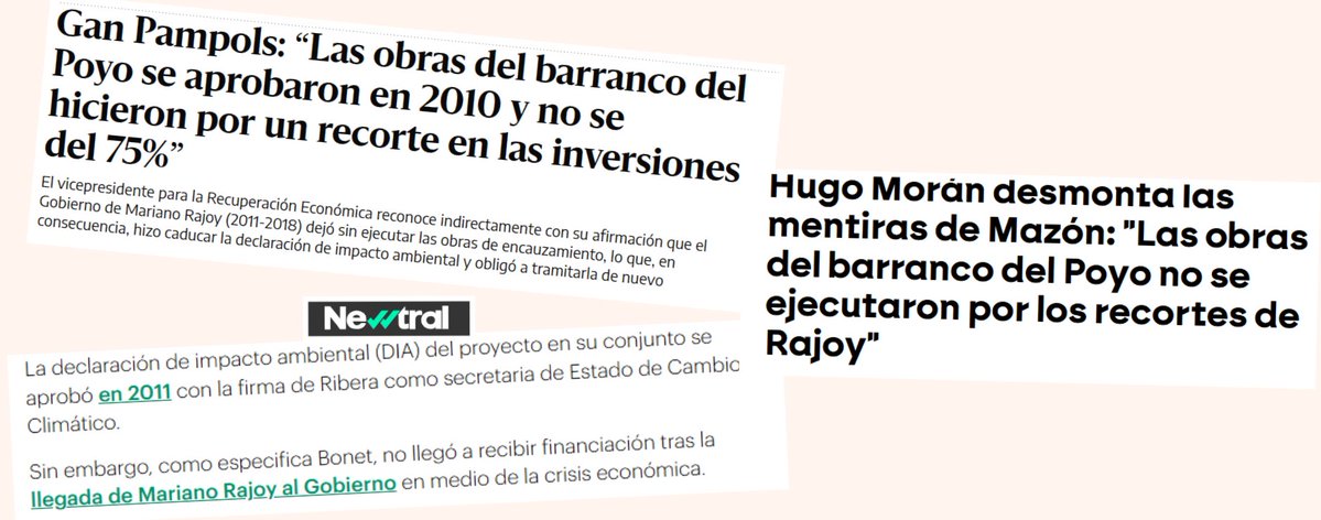 3⃣Pues nada de eso. Dato inicial para vergüenza del PP: las obras tenían proyecto y declaración de impacto en 2011 pero el gobierno Rajoy la dejó caducar y ni siquiera empezó los trabajos en los barrancos del Poio y la Saleta. Hasta el vicepresidente de Mazón lo reconoció.⬇️