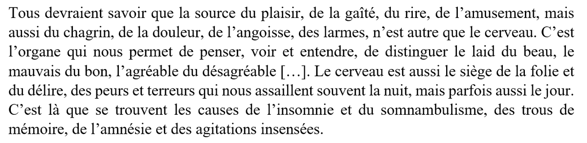 Il comprend déjà que l'épilepsie, le somnambulisme, les problèmes de mémoire, etc. émanent du cerveau.