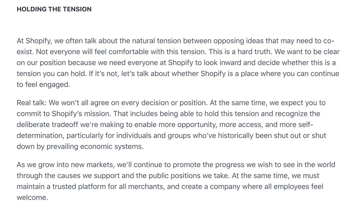 It details a “tension” Shopify employees have to “hold” between “opposing ideas that may need to co-exist.”