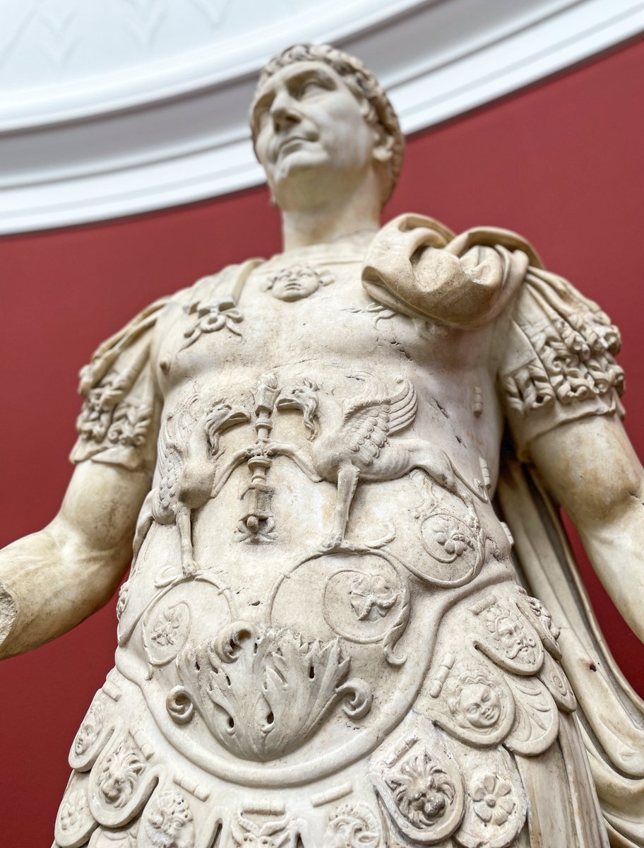 3) The cast bronze trophy shows a general's cuirass armour draped in a cloak, with precisely sculpted leather pteruges strips that provided some defence at the hips. Captured enemy weapons may have also been fixed to monument in ancient times...