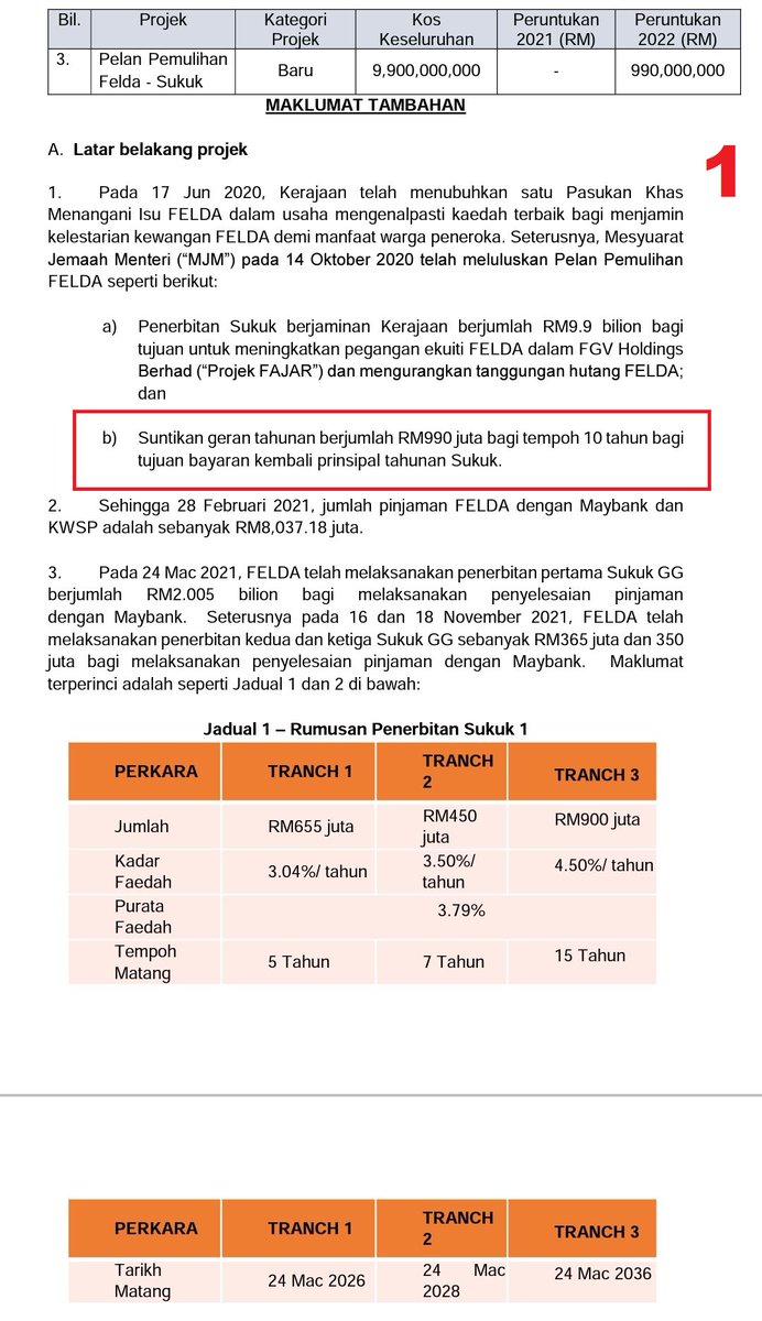 Jadi, dalam Pelan Pemulihan FELDA tu, yg aku kotakkan merah, Kerajaan Muhyiddin setuju secara dasar utk beri suntikan geran tahunan berjumlah RM990 juta setahun, selama 10 tahun.