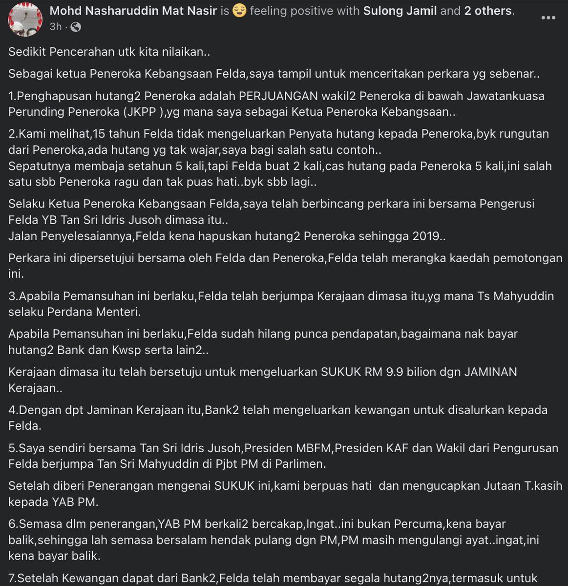 Saudara Sulong berjuang utk hapuskan hutang peneroka. Sbb apa? Dah 15 tahun FELDA tak keluarkan penyata hutang kpd peneroka.
