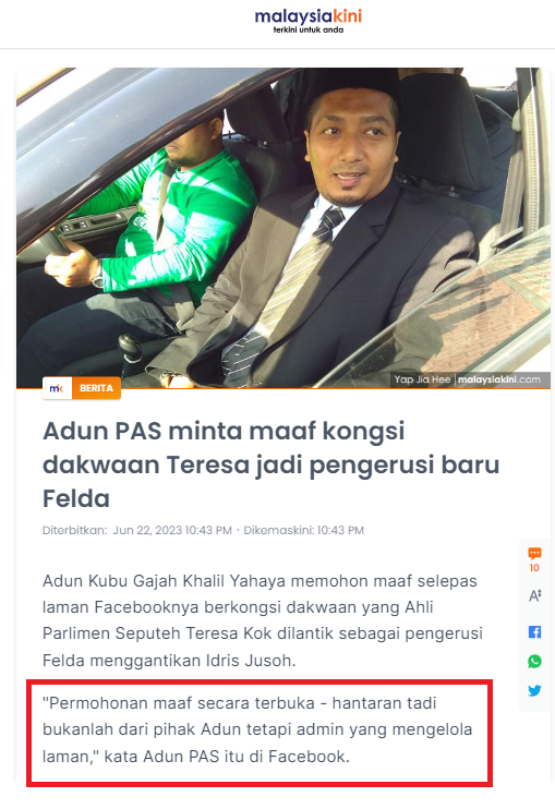 Kecoh Perikatan Nasional buat naratif kata PMX salah tentang hutang peneroka FELDA.