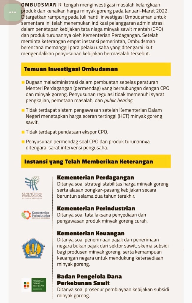 Perubahan harga minyak goreng, karena pasokannya terbatas di lapangan, sejatinya sdh berlangsung sejak 2019. Namun, pemerintah benar-benar baru meresponsnya di awal 2022, menggunakan Permendag No. 1, 3, 6, 8, 11 Thn 2022. Itu pun langsung tercium skandal.