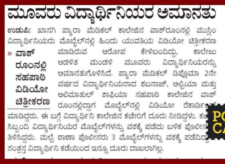 ⚡ Karnataka: Horrific incident in Udupi. Three Female Muslim students Alimatul Shaifa, Shabanaz & Aliya of Prestigious Netra Jyoti College put spy cameras in Hindu girls toilets, recorded Hindu girls showering and using toilets and shared it with Muslim men.