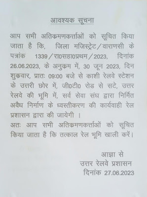 27th June 2023, a notice was pasted on the premises of the Seva Sangh Premises by Northern Railways saying to vacate the land immediately.🍀 7/14