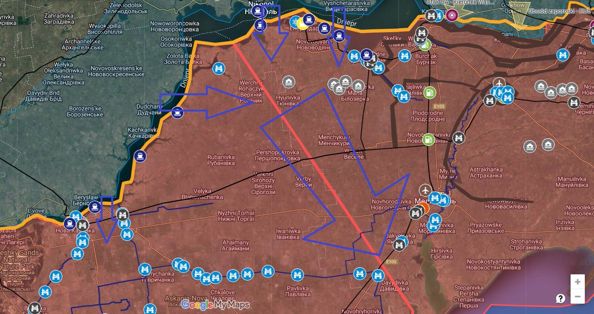 Czy jest na to szansa? Według mnie tak i jest to ostatnia nadzieja dla sił UA jeśli te na poważnie myślą o przecięciu korytarza z Rosji na Krym. Być może ciągły nacisk UA na Zaporożu ma na celu tak naprawdę nie dopuścić, aby RUS mogli tutaj okopać wartościowe jednostki. 37/